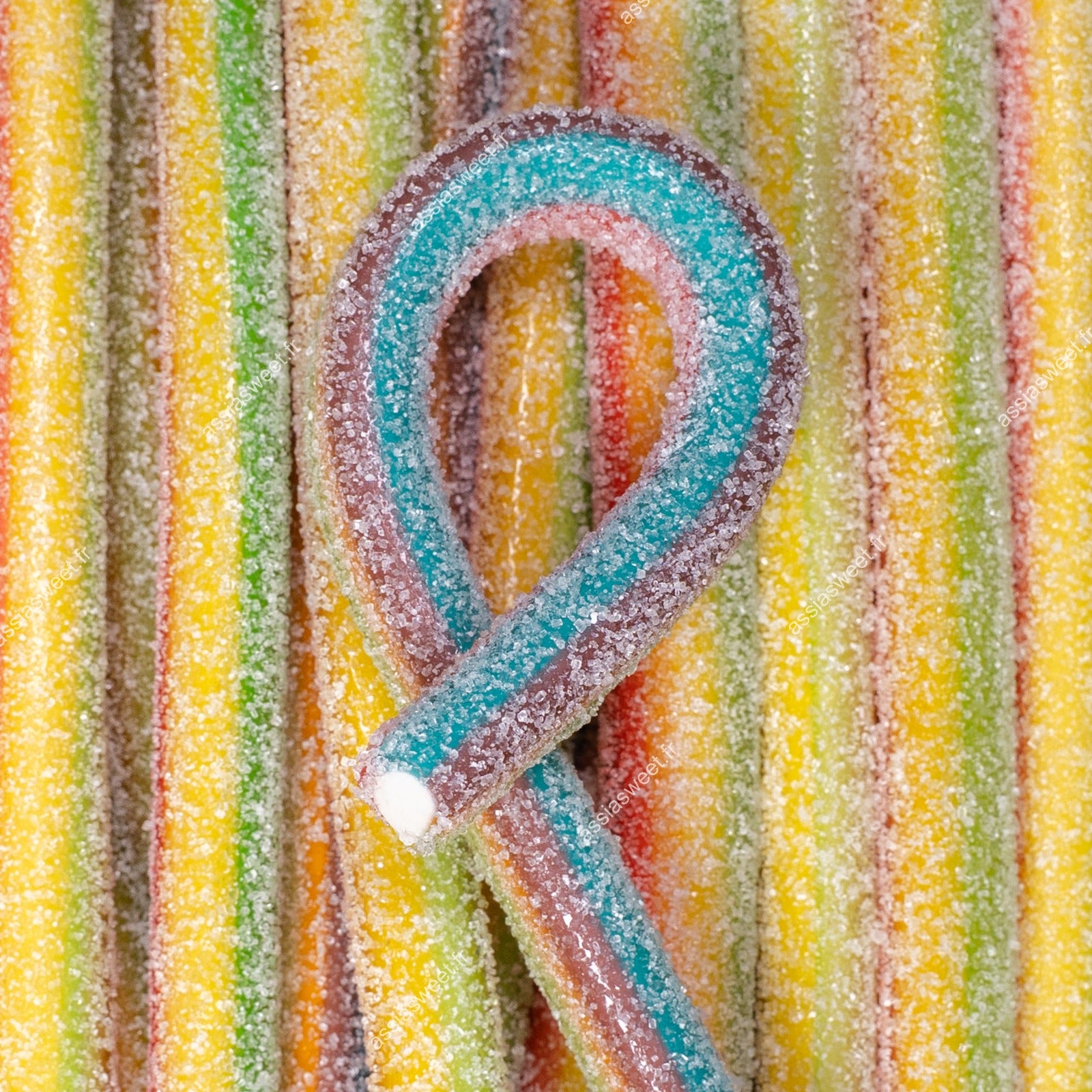 Bonbon multicolore acidulé en forme de tube d'une longueur de 23 cm, fourré d'une délicieuse pâte aromatisée.