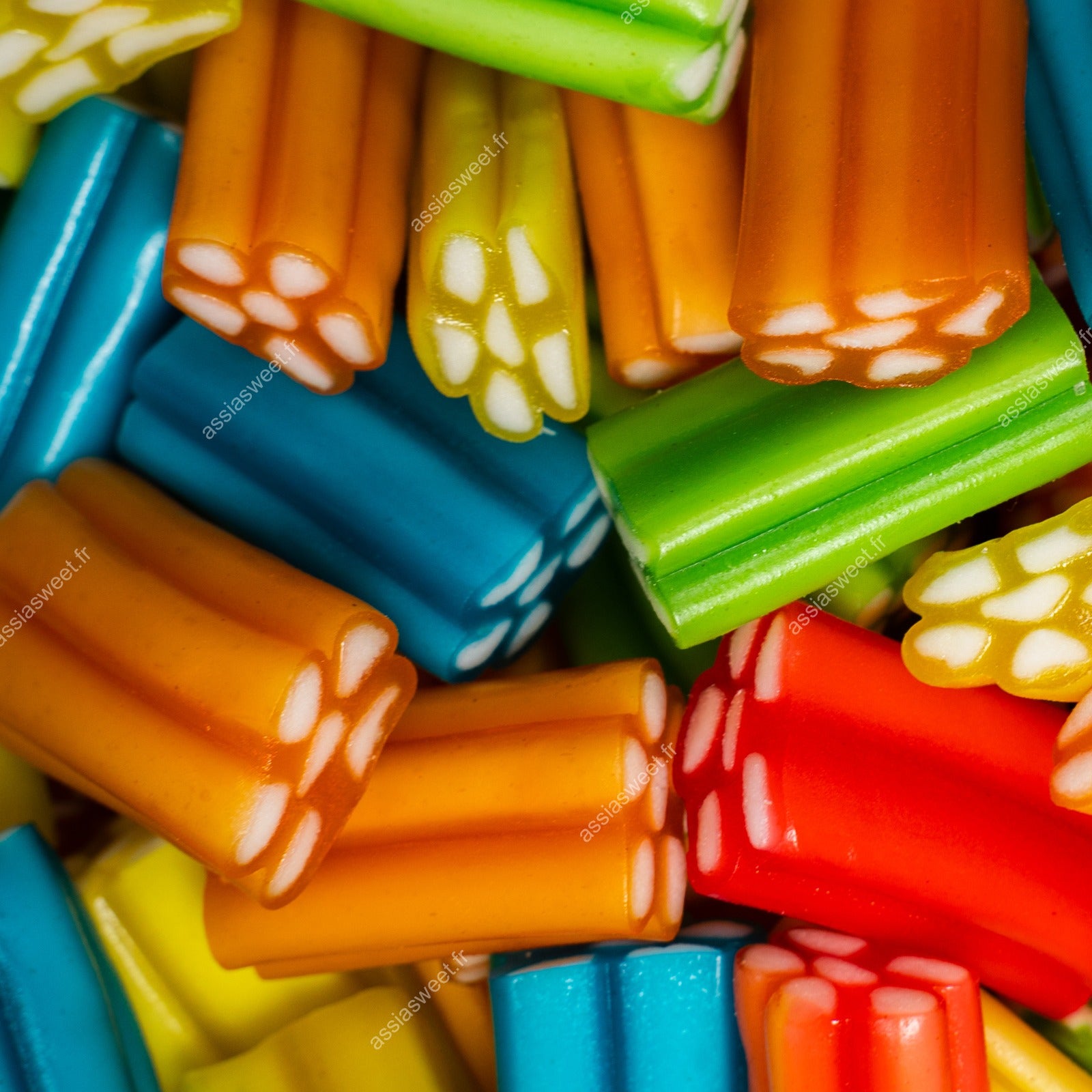 Ingrédients : sucre, sirop de glucose-fructose, amidon, farine de blé (contient du gluten), sirop de sucre inverti, eau acidifiants: E330, amidon de pomme de terre, maltodextrine, humectant:E422, correcteur d'acidité:E332, graisse végétale (palme), gélatine de boeuf halal, arôme artificiel, colorants:E100, E129, E133.