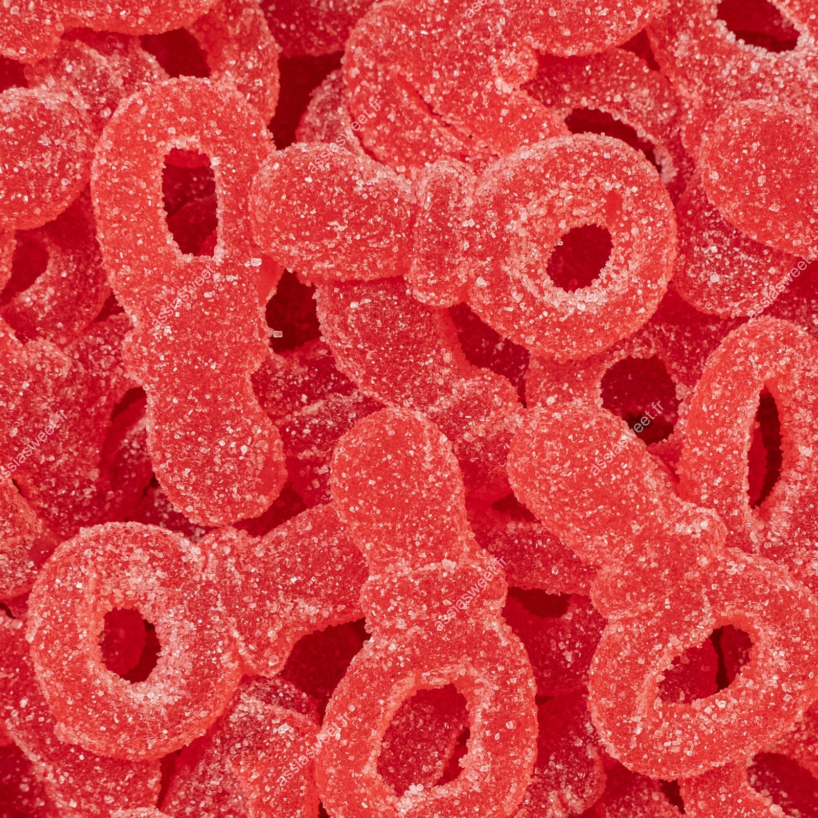 Sucettes rouges acidulées, enrobées de sucre au délicieux goût de cerise. Texture douce.